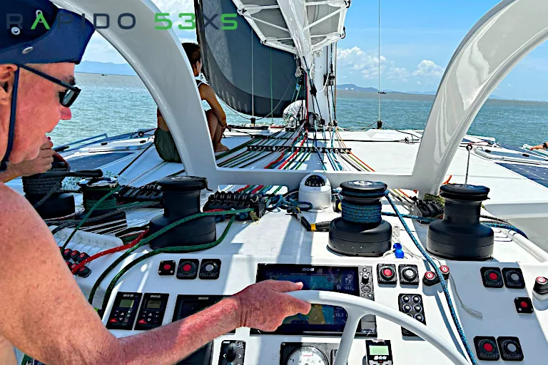 Kein zentrales Ruder: zwei feste Pre-Preg-Carbon-Ruderblätter, eines an jedem Schwimmrumpf, die bis zum tiefsten Punkt des Hauptrumpfs reichen, um den Zugang zu flachem Wasser zu erleichtern.