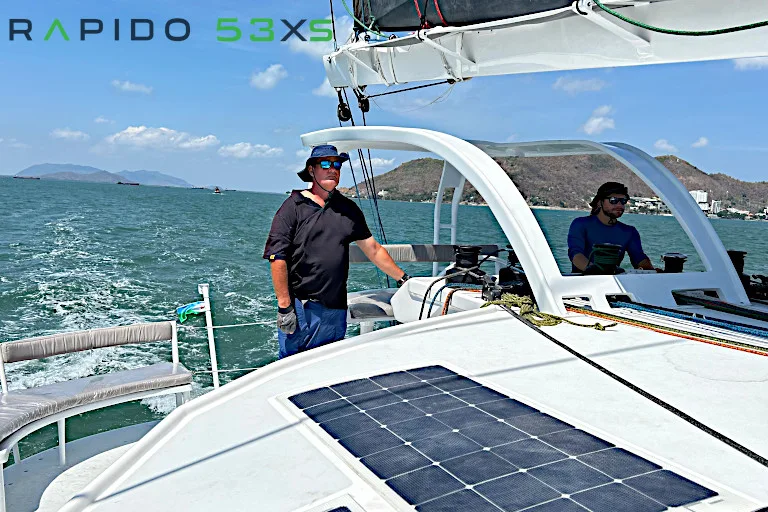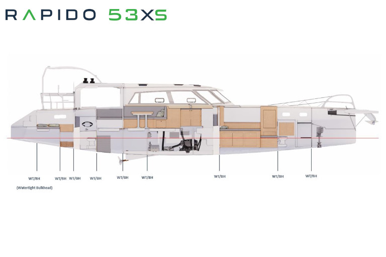 Morrelli und Melvin haben dieses Ergebnis beim XS erreicht, indem sie die gleiche effiziente Form des Rumpfes des Rapido 50 auf Höhe der Wasserlinie beibehalten und ihn verlängert haben. Oberhalb der Wasserlinie erweitert sich der Rumpf, um ein großzügiges Deck zu tragen, was das Gesamtgewicht des Bootes um nur 800 kg erhöht.
